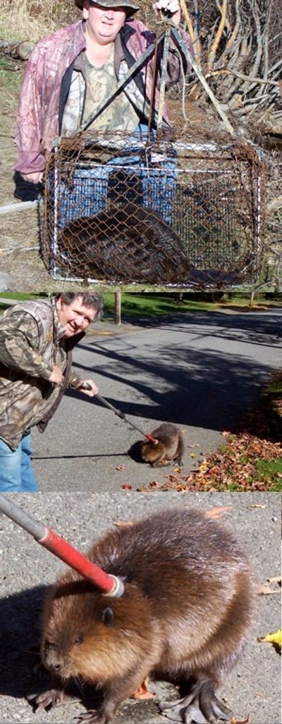 We zig zag from street to street Miss beaver is making a beeline to the river two streets down she is slowing down I see my chance, as she gets to the next lawn, I pull ahead and park my truck jump out and grab my control pole, as I approach Miss beaver she stops and turns and sees my wife Norma and the 2 people that own the house and me  she eyes us all….. You can tell she knows down deep that she can wup all of us ….. she just don't know who will be first. She stands up and lunges at me and I drop the loop of my catch pole down over her head and I pull to tighten the loop she flips and shakes the loop off… round 3 goes to Miss Beaver.