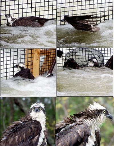 DAMARISCOTTA MILLS (May 13, 06): On any given day in the Midcoast, Rockport Animal Control Officer Maynard Stanley Jr. usually finds himself being called upon to remove errant raccoons and skunks from unwanted places and to help locate the owners of missing pets.So it was a surprise to the stalwart animal wrangler, who owns and operates Critter Catchers and Maine Woods and Waters in Owls Head, when he came upon an osprey fighting for its life against the raging current rushing through a fish screen at the old mill dam in Damariscotta Mills.